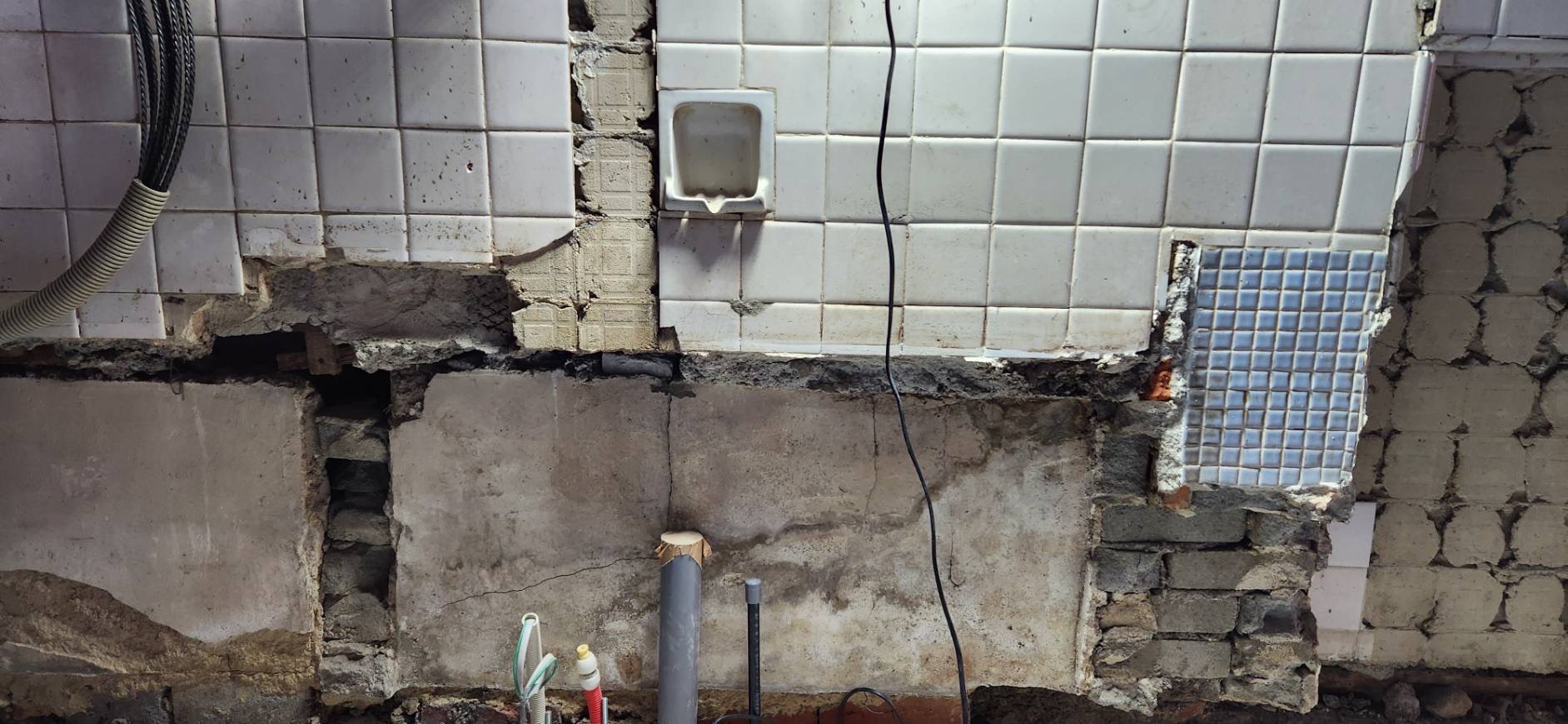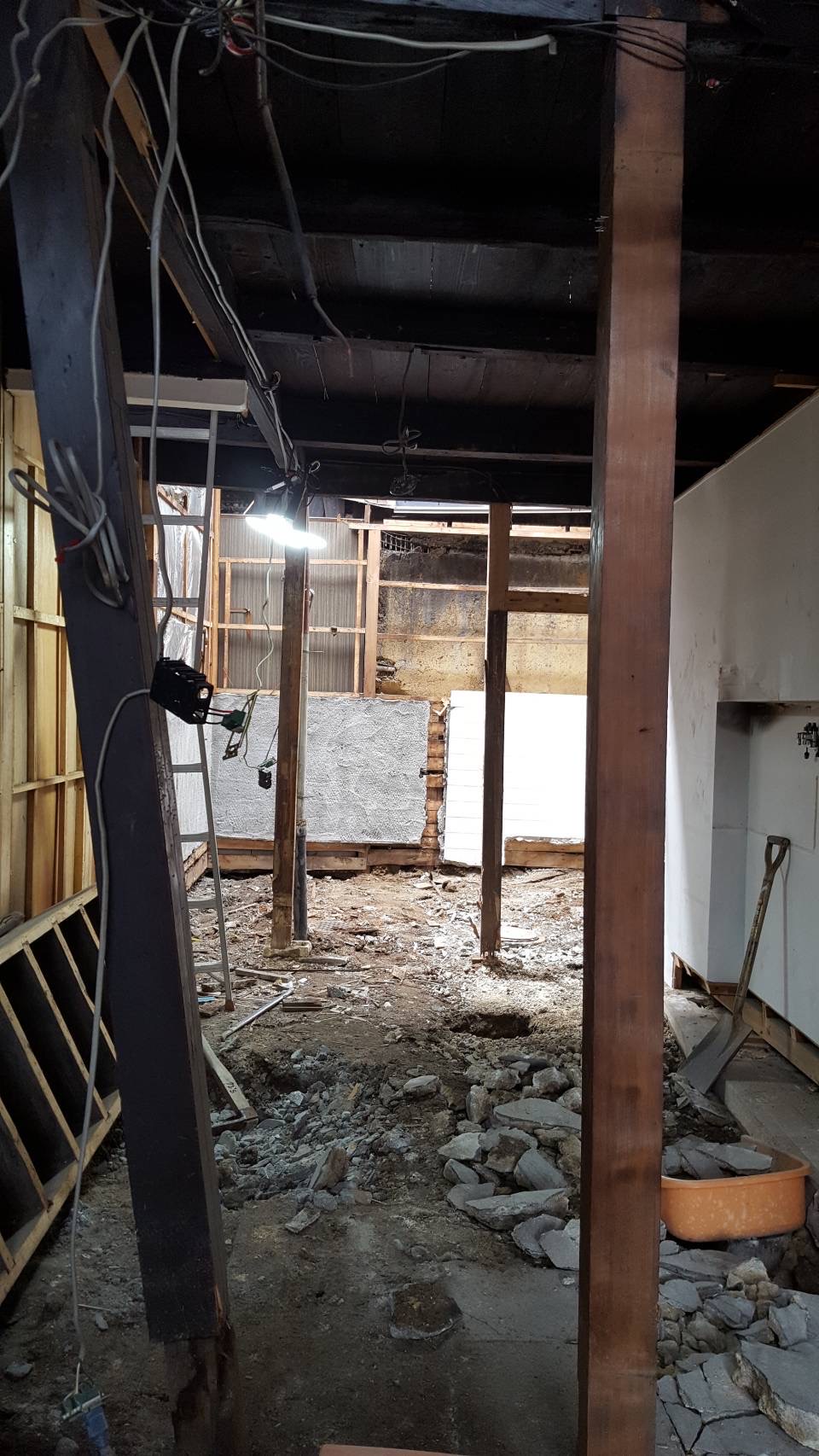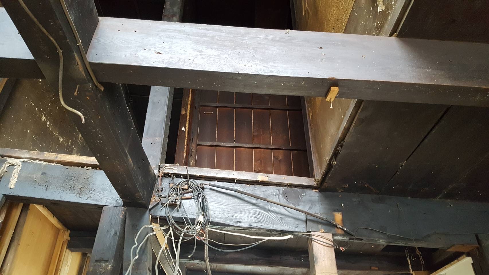 長い間、放置された家。ここは改築が途中で終っており、壁にはベニヤ板が打ち付けられ、元々の家の形跡がそれで覆い尽くされている感じ。屋根は崩壊し、できた大きな穴からは空が見え、床は水浸し。二階の床は今にも抜け落ちそうである。